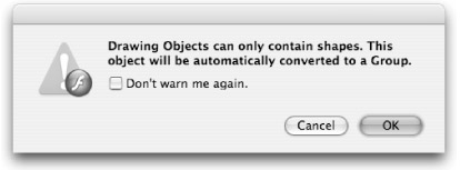 In the simplest terms, Drawing Objects are containers for raw shapes. They cannot hold animation (like symbols can) or even other Drawing Objects. If you try to add a Drawing Object to the Stage when you have another Drawing Object open in Edit mode, you will see a warning dialog box when you return to the Main Timeline. As shown in Figure 9-38, Flash will automatically convert the original Drawing Object into a group so that the new Drawing Object can be nested inside it.