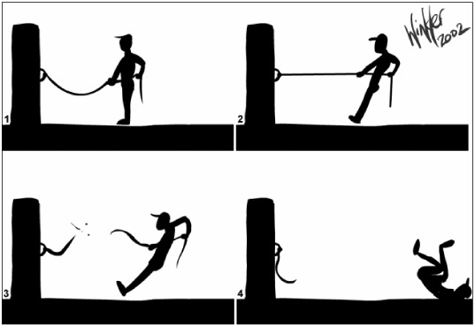 This is the most commonly quoted of Newton's Laws: "For every action there is an equal and opposite reaction." Although this law is often used as a metaphor for human behavior, it was originally intended to explain how forces interact and affect objects. This is the law that explains how far backwards a character may fall when pulling on a rope that breaks. The force is directed along the rope and acts equally on objects at either end of the rope — the end result is that a character literally pushes himself backwards by pulling on the rope, as shown in Figure 10-9.