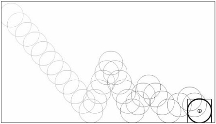 This is also the law that explains why a ball bounces back into the air when it strikes the ground. If there weren't any gravity or friction acting on the ball, it would bounce back to the exact height that it originally fell from. The actual result is that the ball reaches only a percentage of its original height with each bounce; this percentage depends on how hard the surface is and how heavy and/or bouncy the ball is. You can plan a realistic series of bounces by using a consistent percentage to calculate the descending height of each bounce. The bounce shown in Figure 10-10 was calculated by using a multiple of 0.5 (or ½) for the distance traveled in each bounce.