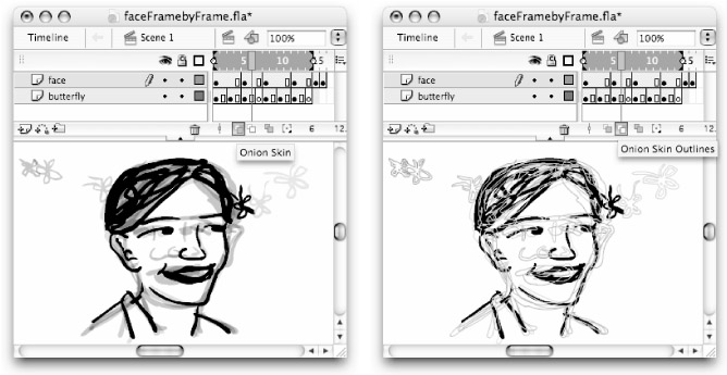The current frame (indicated by the position of the Playhead) is displayed at 100 percent opacity, while the other frames in the sequence are displayed at a slightly reduced opacity or as outlines, depending on the Onion Skin button you have selected.