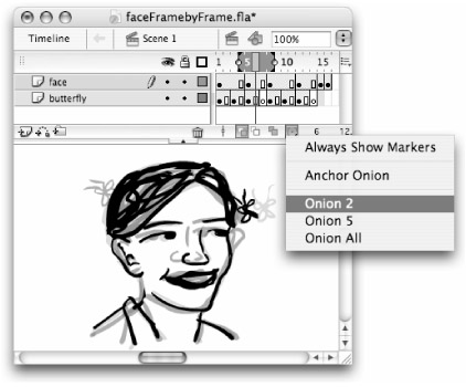 The number of frames that are included in the Onion skin display can be controlled either by choosing a setting from the Modify Onion Markers menu (shown in Figure 11-5), or by selecting the round marker handles with the Selection tool and sliding them to a new position on the Timeline. The number of frames that you select from the Modify menu will be shown before and after the current frame — so in our example with Onion 2 selected, the Onion markers actually span five frames (the current frame, plus two frames on each side).