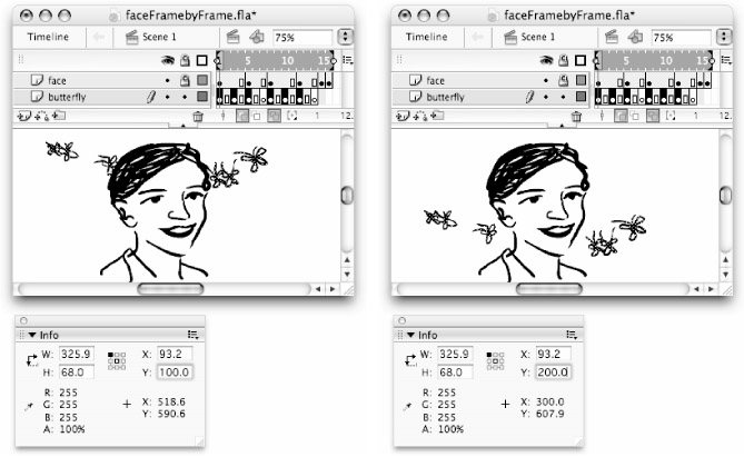 To control the pacing of your animation, you can add more frames (F5) between the keyframes (creating a span), or add more keyframed (F7) images to the sequence to extend its length. Adding more frames between keyframes will "hold" or pause the animation until the Playhead hits the next keyframe with changed content. In the example shown in Figure 11-2, the face holds on some frames while the butterfly continues to move in keyframed drawings on its own layer. To speed up (or shorten) animation, you can remove frames (Shift+F5) or keyframes (Shift+F6) to shorten the sequence. You can make changes in the length of a span by selecting a frame in the span that you want to modify and using the application menu commands (or shortcut keys), or you can simply drag the endframe of the span to change its position on the Timeline.