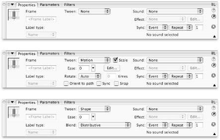 The type of tween that you want to apply is selected from the Tween menu in the Property inspector. As shown in Figure 11-7, the options available for controlling the playback of the final tween depend on the type of tween selected.