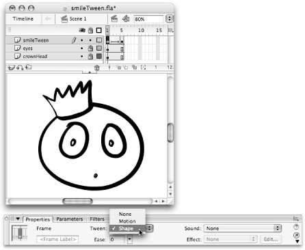 The smileTween.fla example file is located on the CD-ROM in the shapeTween sub-folder of the ch11 folder. |