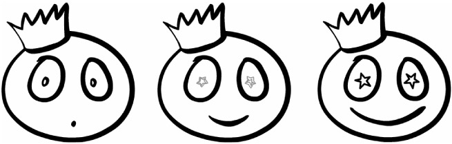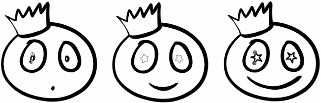 Because Flash calculates the simplest way to interpolate from one shape to another, you occasionally get unexpected results if the shapes are complex or extremely different from one another. Shape tweening becomes less reliable the more points there are to be calculated between the defined keyframes. In our example, we have added a keyframe at the end of the span with the eyes of the character changed from circles to stars. We want the animation to be a smooth transition from the rough circle to the star shape in each eye. As shown in Figure 11-12, a basic Shape tween results in some odd inbetween shapes.