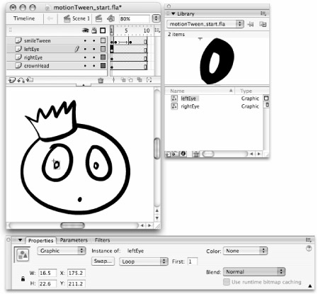 Create your own file from scratch, or open motionTween_start.fla from the MotionTween subfolder of the ch11 folder on the CD-ROM. To view the final animation, open motionTween_final.fla (or .swf) from the same location. |