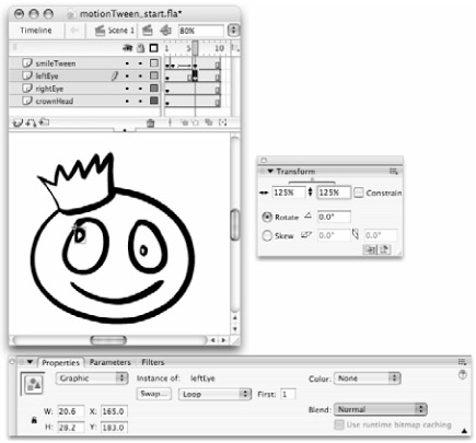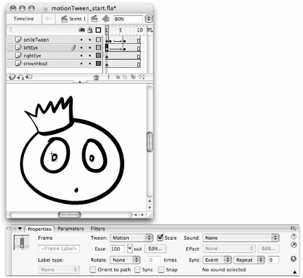 If the overall speed of the tween seems too fast or too slow, you can extend or reduce the length of the span. The fastest way to increase the span on all visible layers is to move the Playhead to the center of the span, make sure none of the frames are selected on any of the layers and that the layers are all unlocked, then use the F5 key to add more frames. We added five frames to the overall span of the smileTween sample to slow the animation down. |