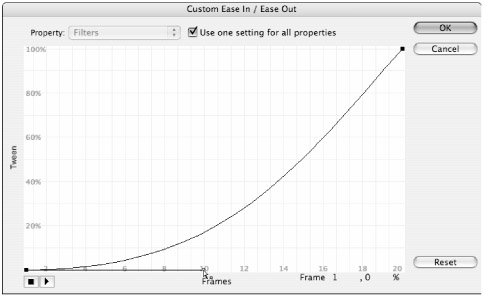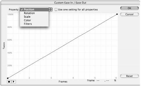 Deselecting the default Use one setting for all properties check box resets all curves to the standard diagonal line. If you have spent time working on a custom easing curve that is being applied to all the properties of your tween (the default setting) and you decide to deselect the Use one setting for all properties check box, be sure to use the Copy command (Ctrl+C or z+C) to save your curve in the buffer so that you can Paste it (Ctrl+V or z+V) back in to the curve view for the specific property you want to control. |