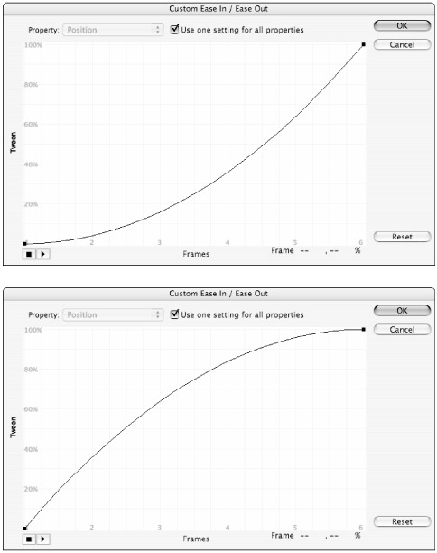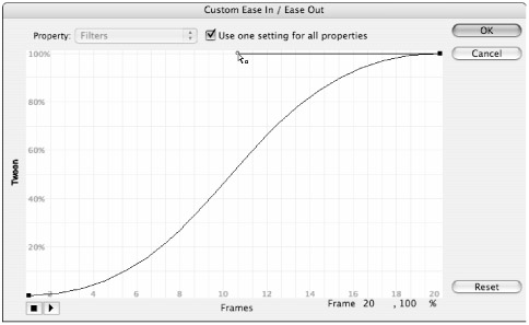 If you set Easing with the value field or the slider control in the main Property inspector and then click the Edit button, the value of Ease In or Ease Out that you apply will be rendered in the Custom Easing curve. This is a good way to get an idea of how the visual curve control relates to the standard easing values. |