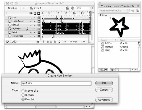 Create a new symbol by choosing Insert ð New Symbol from the application menu (Ctrl+F8 or z+F8). Assign the symbol Movie Clip or Graphic behavior and give it a name that will be useful for identifying the animation, as shown in Figure 11-26.