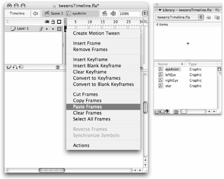 After you click OK to close the Create New Symbol dialog box, the symbol is automatically opened in Edit mode — you will see the symbol timeline rather than the Main Timeline in the Timeline window. Select the first frame of the symbol timeline and choose Paste Frames from the contextual menu, as shown in Figure 11-27. Or choose Edit ð Timeline ð Paste Frames from the application menu (Alt+Ctrl+V or Option+z+V).