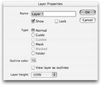 Guide layers are the only layer types that are not exported with your final Flash movie (.swf). Guide layers are used primarily when you need to use an element as a reference in the authoring environment (.fla), but you don't want it to be part of the finished movie (.swf). To convert an existing layer into a Guide layer, you can use the contextual menu and select Guide. Alternatively, you can invoke the Layer Properties dialog box (shown in Figure 13-2) by double-clicking the layer icon (or choosing Modify ð Timeline ð Layer Properties from the application menu), and then selecting the Guide check box.