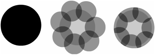To illustrate the way that symbols can be reused as both graphic content and as mask elements, we have used instances of a symbol as static content on a masked layer and then Motion tweened another instance of the same symbol on a Mask layer to create an animated oval reveal. Figure 13-15 shows the symbol instance used on the Mask layer (on the left), the symbol instances used on the art layer (in the center), and the final mask effect visible when both layers are locked (on the right).