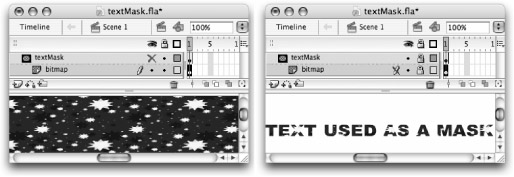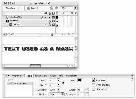 The solid copied text completely obscures the masked image below, but using the new Flash 8 Filters, you can apply a Filter and use the Knockout option to drop out the fill of the text characters so that the masked content on the other layers will be visible.