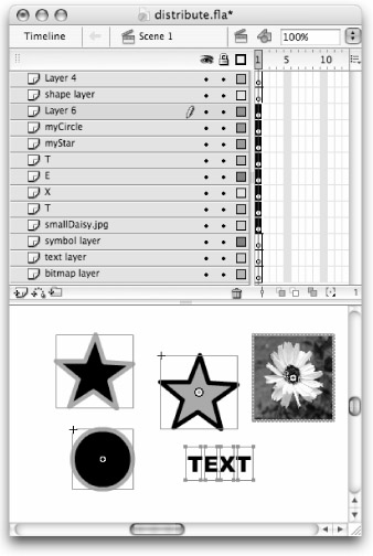 The Distribute to Layers command (Shift+Ctrl+D or Shift+z+D) is a great timesaver if you're managing multiple elements that you need to move to animate on individual layers. If you've imported several items to the Document window, or you've created a complex graphic that you decide needs to be split up on different layers, you can use this command to do most of the work for you. Instead of having to manually create new layers and copy and paste items one by one, you can select a number of individual items in the Document window and apply Distribute to Layers to have Flash automatically create a layer for each selected item.