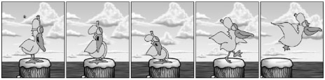 Anticipation is a technique used to indicate that characters are about to do something, like take off running. Before lunging into the sprint, characters slowly back up, loading all their motion into their feet until their motion reverses and sends them blasting off in the other direction. In a more subtle form, this is shown in Figure 14-1, when Weber the pelican crouches before he takes flight from his perch on the pier.