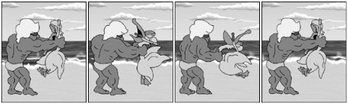 Visualize a jogging Santa Claus, his belly bouncing up and down with each step. Because of its weight, his belly is still on a downward motion when the rest of his body is being pushed upward by the thrust of his leg. This opposing motion is known as overlapping actions. Overlapping action does not only happen in an up-and-down motion; it can happen in any direction. An example of side-to-side overlapping actions is shown in Figure 14-2. Note that, as the bully thrusts forward, Weber's body reacts in the opposite direction … only to catch up just in time for the thrust to reverse and go the other way.