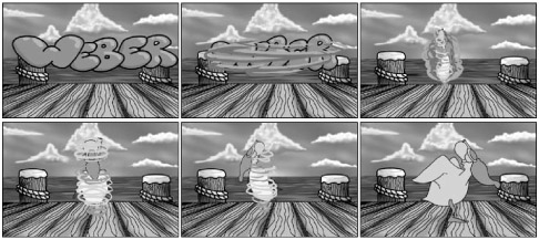 Blurring is a technique or device that animators use to signify a motion that's moving faster than the frame rate can physically show. In film, this manifests itself as a blurred out-of-focus subject (due to the subject moving faster than the camera's shutter can capture). You may have already employed this effect in Photoshop, with the motion blur filter. In cartoon animation, blurring is often (and easily) described with blur lines. Blur lines are an approximation of the moving subject using line or brush strokes that trail off in the direction that the subject is coming from. When used properly, this great device can save hours of tedious drawing. An example of animated motion blur used to indicate a spinning motion is shown in Figure 14-3, which is a sequence in which the word "Weber" turns into Weber the pelican.