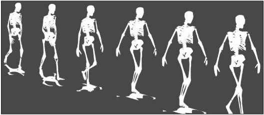 Notice that the main pivot points of the figure create a balanced pattern that can be used as a basis for many other kinds of figures. Also notice that as the figure moves through the cycle, there is a slight up and down movement that creates a gentle wave pattern along the line of the shoulder. This wave motion is what will keep your figure from looking too mechanical. It is important to remember that the final pose in the cycle is not identical to the first pose in the cycle — this is crucial for creating a smooth loop. Although it might seem logical to create a full cycle of two strides and then loop them, you will get a stutter in the walk if the first and last frames are the same. Whatever pose you begin the cycle with should be the next logical "step" after the final pose in your cycle, so that the pattern will loop seamlessly.