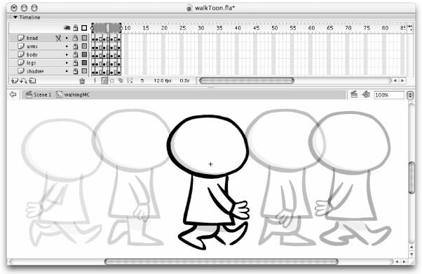 In Flash, the usual workflow is to set keyframes for a symbol and then to tween the intervening frames, which harnesses the power of the computer to fill the inbetweens. Although this is fine for many things, it is inadequate for many others. For example, a walk sequence is too subtle and complex to be created simply by shape or motion tweening the same figure — each key pose in the walk requires a unique drawing. So, let's take a look at the traditional use of keys and inbetweens for generating a simple walk sequence that starts and ends according to a natural pace, yet will also generate a walk loop.