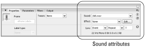 Select the frame of the button state where you want to add a sound for interactive feedback (such as a clicking sound for the Down state), and then access the Property inspector by choosing Window ð Properties ð Properties (Ctrl+F3 or z+F3).