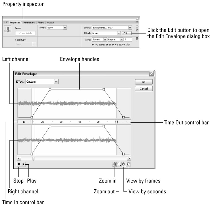 Seconds/Frames: The default for viewing sound files is to represent time in seconds. But viewing time in frames is advantageous for syncing Stream sound. Toggle between viewing modes by clicking either the Seconds or Frames button at the lower right of the Edit Envelope dialog box.