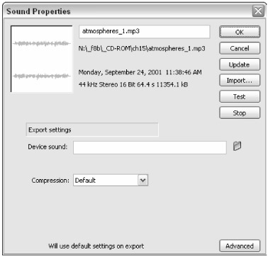Import: This enables you to import another audio file into the Flash environment. The imported audio file will overwrite the existing sound displayed in the Sound Properties dialog box, but will retain the original sound's name. This feature is useful if you originally imported a placeholder or low-quality sound and need to specify a new file to be used in its place.