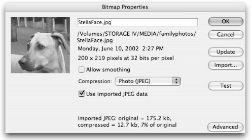 The Bitmap Properties dialog box, shown in Figure 16-6, has several options that are used to control the quality of your imported bitmaps. Settings in the Bitmap Properties dialog box will override the default JPEG compression setting for the document that is controlled in the Flash tab of the Publish Settings dialog box (File ð Publish Settings).