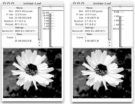 Compression type drop-down: The compression setting enables you to set the bitmap's compression to either Photo (JPEG) or Lossless (PNG/GIF). Photo is good for very complex bitmap images (photographs for example); Lossless is better for graphic bitmap images with simple shapes and fewer colors. Play around with these settings to see which works best to give you a balance between file size and image fidelity for each particular image. Figure 16-7 shows a comparison of these two settings applied to an imported GIF image (top) and applied to an imported JPEG image (bottom). The GIF with default lossless compression is only 4.7 KB. Applying a reduced JPEG Quality compression of 50 results in a larger file size (7 KB) for a poorer-looking image. Conversely, the JPEG with a Quality of 50 is only 9 KB, while the JPEG forced to lossless compression is 145.6 KB, without a huge difference in display quality.