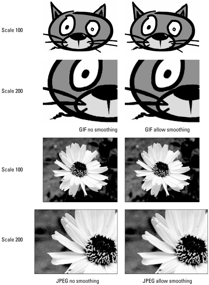 Allow Smoothing (anti-aliasing): Select this check box to enable Flash to antialias, or smooth, the edges of an image. Results may vary according to the image. Generally, this is not recommended for non-scaled graphics because it can soften the image. However, smoothing can be beneficial for reducing jagged edges on low-res images scaled in an animation. Smoothing in Flash 8 is greatly improved over older versions of Flash, so it can be applied with less caution. Figure 16-9 shows the effect of smoothing applied to a GIF image (top), and smoothing applied to a JPEG image (bottom).