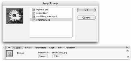 When a bitmap is selected in the Document window, the Property inspector displays the bitmap's name, symbol type, current size, and X, Y location. In addition to these basic bitmap properties, the Property inspector offers two useful options — the Swap button and the Edit button.