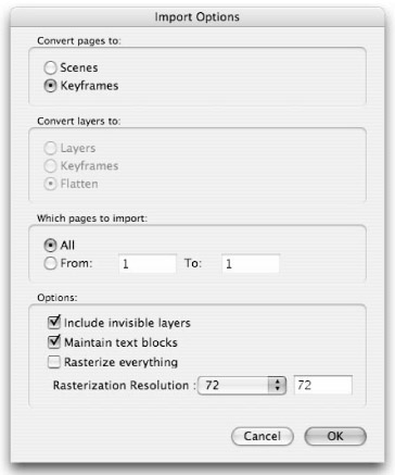Depending on your options, the artwork will be imported to a single layer or to multiple layers or keyframes in your Flash document after you click OK.