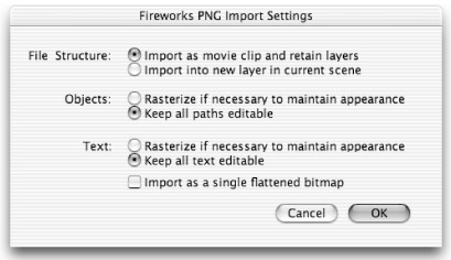 As with most files created in external applications, you will find that rasterized and flattened Fireworks vector artwork and text will import more consistently to Flash, but you also lose all the benefits of having editable vector art and text. Although the option for launching Fireworks at any time to edit the original PNG file does make rasterized Fireworks images less limiting than other bitmaps, it is usually worth the little extra time you might need to spend simplifying your artwork to get it to import to Flash with vectors and editable text intact. Any special fills or textures that have been applied to your text in Fireworks will be lost if you choose to preserve editable text on import to Flash.