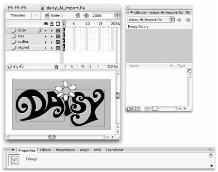 Any small inconsistencies in fill style are easy to fix once the elements are ungrouped in Flash. Remember that you can delete fills, add strokes, scale, or otherwise modify the imported artwork with any of the Flash tools.