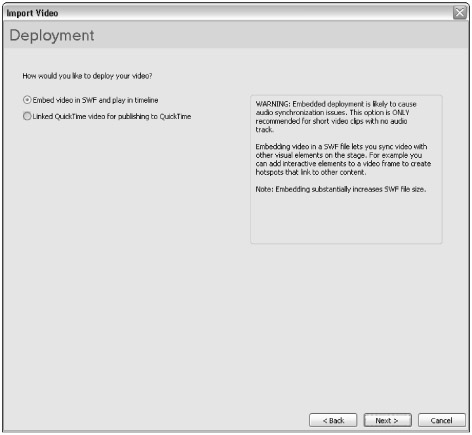 Embed video in SWF and play in timeline: This option is selected by default, and adds the encoded video clip to the current Flash document's Library panel. As the note on the right of the Deployment screen indicates, this option can substantially increase your final Flash movie (.swf) file size. Also, because the audio track of the compressed video clip will be within the Flash movie, you should make sure you match the encoder's frame rate to that of your Flash movie.