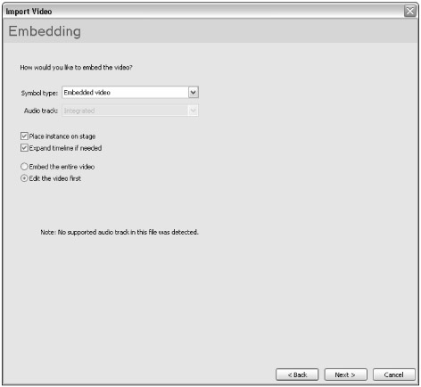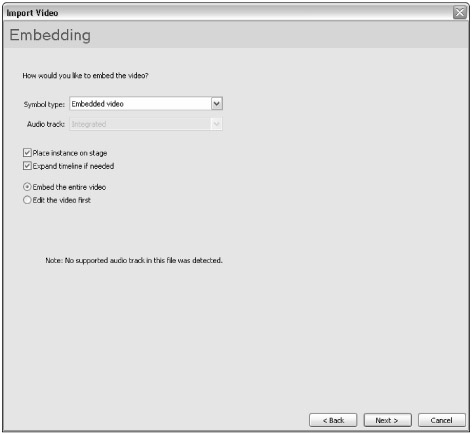 Audio track: This menu controls how the audio track (if it exists) of the video asset is handled. The default value, Integrated, keeps the audio track bound inside of the embedded video symbol after import. When you use this option, you control the compression of the audio track via the audio stream settings in the Flash tab of the Publish Settings dialog box (File ð Publish Settings). The Separate option tells Flash 8 to store the audio track as a separate Sound asset in the Library panel. If you use this option, you must physically place this Sound asset on the starting keyframe of the video layer in the Timeline window. (You can put the sound on another layer on the same timeline as well.) Be sure to set this sound to use a Stream sync, to ensure proper playback. If you choose None in the menu, the audio track is stripped from the video asset; the audio, then, is not imported into the Flash document.