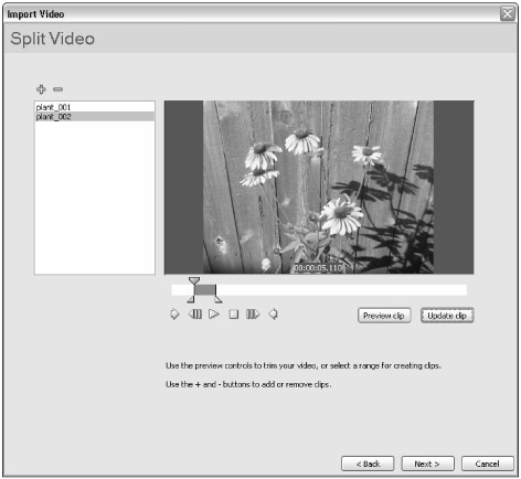 Here, you can drag the in and out markers to specific sections of your video file. Click the plus (+) button to add a new segment to the editing list (on the left side of the wizard). You can click the text area of segment names in the editing list to rename the clips — these names translate to the names of the imported video symbols in the document's Library panel.