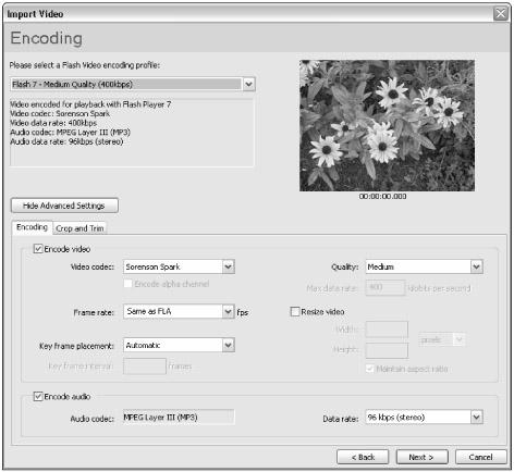 If you're willing to sacrifice visual quality of your Flash Video content and want the security of appealing to a larger audience (that is, people who have either Flash Player 6 or 7 installed, but not Flash Player 8), you may want to encode your video content with the Sorenson Spark codec. The quality of Sorenson Spark encoding is not necessarily poor compared to other Web video codecs; however, the built-in encoder that ships with Macromedia Flash 8 tools can only encode video in the Basic edition of the codec; you'll need to use Sorenson Squeeze or another third-party utility to encode video with the higher quality Pro edition of the Sorenson Spark codec.
