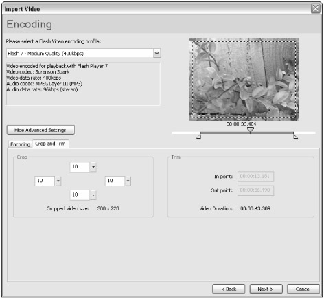 Even though the Crop and Trim tab isn't displayed for the Flash 8 presets, you can still drag the in and out markers to trim your clip. |