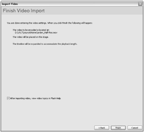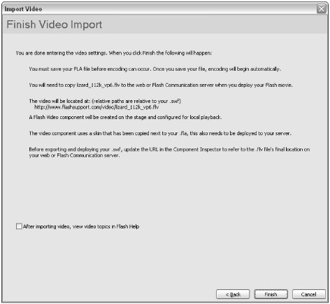 After you have picked a skin, click the Next button. As shown in Figure 17-13, you are taken to the Finish Video Import screen (as described in the Flash Basic 8 coverage of the Video Import wizard). The Finish Video Import screen describes the steps you will need to take once you have finished the import process.