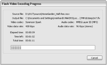 After you click the Finish button, the Flash Video Encoding Progress dialog box appears, indicating the progress of the video encoding session (see Figure 17-8).