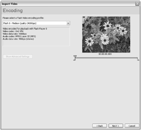 On the Encoding screen, choose the Flash 8 — Medium Quality preset. This preset uses the new On2 VP6 codec available in Flash Player 8, and uses a video data rate of 400 Kbps, yielding a better-than-average image quality for the video clip (see Figure 17-10). Click the Next button to proceed to the next screen.