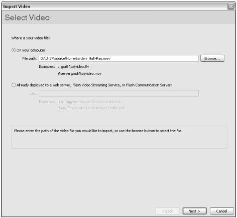 Create a new Flash document and choose File ð Import ð Import Video in Flash Pro 8. The Select Video screen of the Import Video dialog box (see Figure 17-11) presents you with two options: