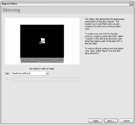 You can select one of several skins in the Skin menu. All of these skins are separate .swf files included with the Flash Pro 8 installation. Whichever skin you choose is automatically copied to the location of the current Flash document you're importing the video file into. This .swf skin file must be uploaded along with your Flash document's .swf file to the Web server, so that the FLVPlayback component can load the skin into the Flash movie. If you prefer to make your own video playback controls to use with the FLVPlayback component, you can choose None in the Skin menu. You can also choose Custom Skin URL and enter the path (relative or absolute) to the skin .swf file you created for the FLVPlayback component.