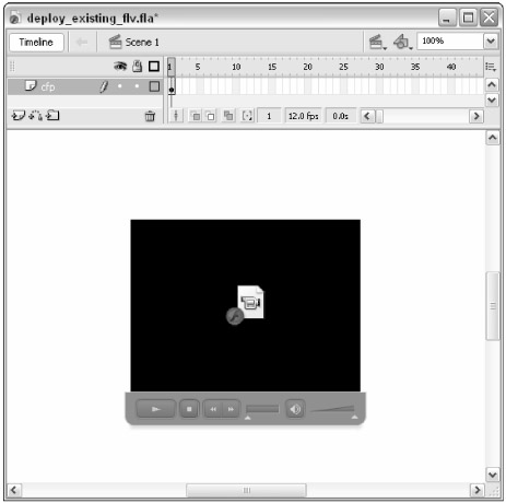 Click the Finish button. You are prompted to save your Flash document (.fla). Save the document as deploy_existing.fla anywhere on your computer. After you have saved the file, Flash Pro 8 loads the metadata from the .flv file you specified during the Import Video process. The width and height data from the .flv file are used to size the instance of the FLVPlayback component that Flash Pro 8 places in the center of your Stage area, as shown in Figure 17-14. Rename Layer 1 to cfp, short for component FLVPlayback. In the Property inspector, name the instance cfp as well.