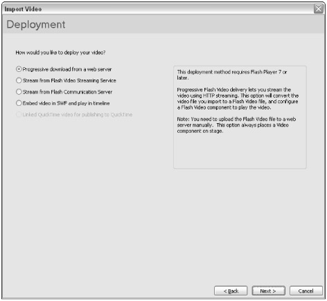 After you have selected a source clip, you can choose how you want to include the video clip in your Flash movie. If you're using Flash Basic 8, you have at most two options (as shown in Figure 17-2):