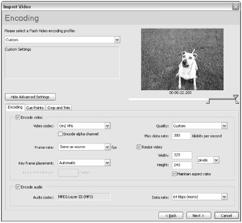 The Encoding screen, shown in Figure 17-17, has expanded functionality in Flash Pro 8 as well. Not only can you specify advanced options for the Flash 7 presets using Sorenson Spark, but you can also modify the advanced options for the new On2 VP6 codec! For this example, choose the Flash 8 - Medium preset in the profile menu and click the Show Advanced Settings button. Also, we intentionally used the stella_raw.mpg clip because the first three-quarters of the clip should be cut from the clip. Drag the in marker about 22 seconds into the clip, as shown in Figure 17-17. In the Quality menu, choose Custom and type 300 in the Data rate field. Also, check the Resize video option, and enter 320 for the width and 240 for height. Change the audio data rate to 64 kbps, as the audio track for this clip is not high-fidelity — it's just our dog Stella barking. Click the Next button to proceed to the next stage of the import process.
