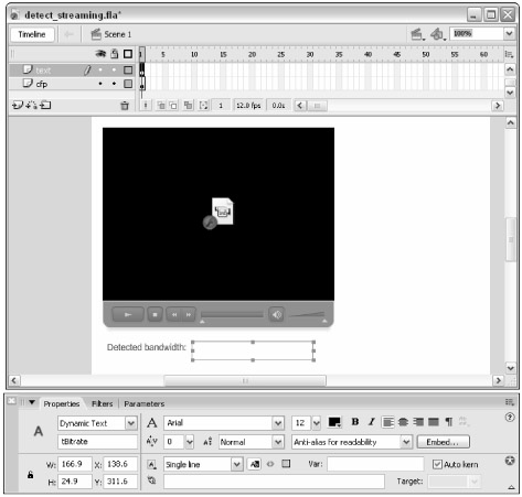Create a new layer named text. Place this layer at the top of the layer stack. Below the cfp instance, use the Text tool to add the static text Detected bandwidth:. To the right of that text, create a Dynamic text field named tBitrate, as shown in Figure 17-32. Optionally, you can set this text field to use the new Anti-alias for readability setting. You must embed the font you use in this Dynamic text field in order for this new feature to work.