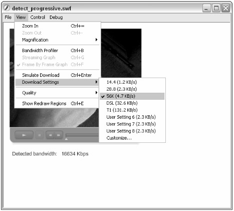 Save the Flash document, and test it (Ctrl+Enter, or z+Enter). Because all of the files are local (that is, on your computer), you'll likely see incredibly high data rates reported in the text field below the component. However, you can use the download simulation feature available in Test Movie to test other connection speeds. As you test the movie, choose View ð Download Settings ð 56K, as shown in Figure 17-34. Open the Bandwidth Profiler in order to watch the download simulation (View ð Bandwidth Profiler). Then, choose View ð Simulate Download. The stage of the movie remains white while the Flash movie loads. Once the file loads, the poster frame download initiates, and the bitrate of the Flash movie is determined. Then, the appropriate .flv file is loaded, as specified by the SMIL file. For the 56K simulation setting, you should see the lizardVP6_56K_Dial_Up_Stream.flv play. Feel free to try other download speeds with the Simulate Download feature.