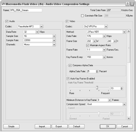 Once the preset is added to the clip, expand the preset below the source clip. Double-click the VP6 Pro codec listing to open the Audio/Video Compression Settings dialog box. Within the Video area of the settings, choose 2-pass VBR in the Method menu. For Frame Rate, choose 1:1. Select the Compress Alpha Data check box. Select the Auto Key Frames Enabled check box. Review the settings shown in Figure 17-41. Click OK to accept the new settings.